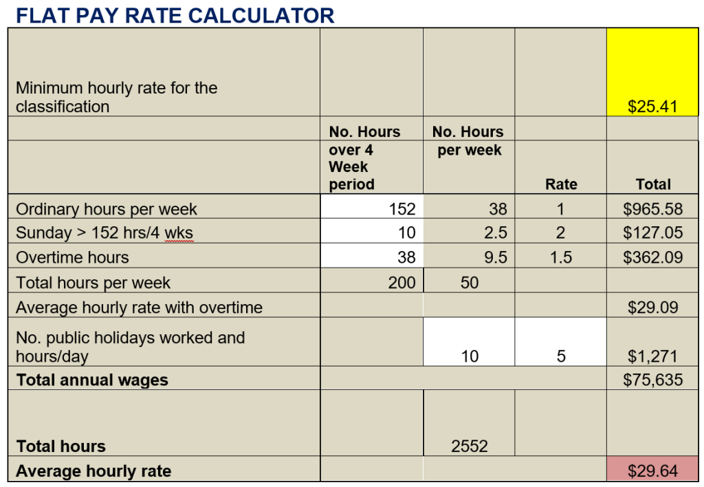 Use the flat rate calculator (excel spreadsheet) to work out the hourly flat rate that takes into account overtime and penalty rates.